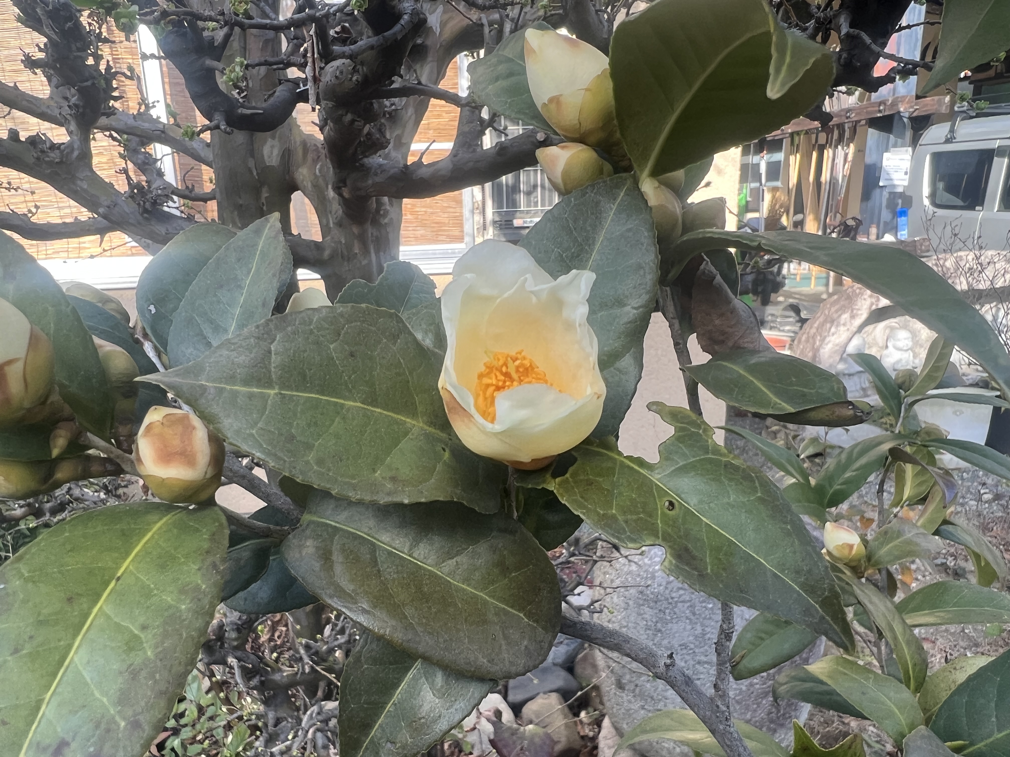 家の前の椿が咲き始めました。