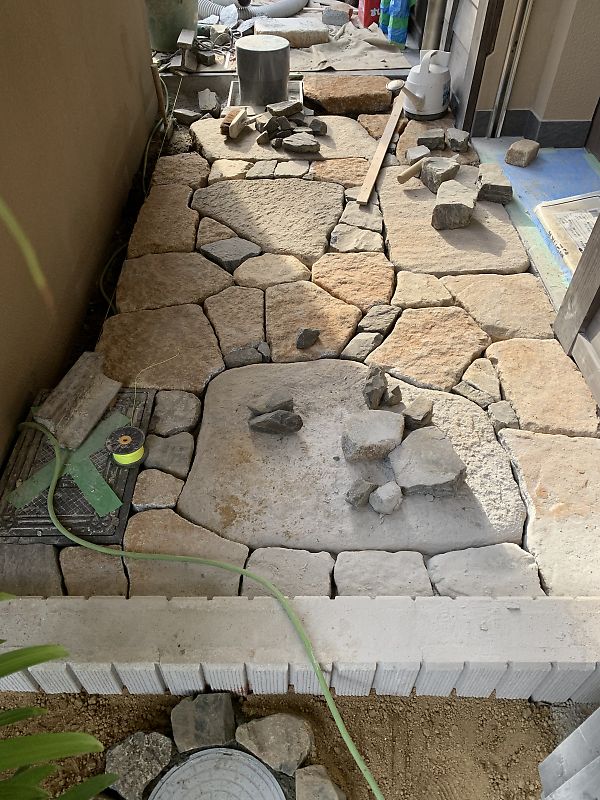 こんな仕上げになります。今年の春に施工した延べ段ですが、大判は丹波鞍馬石 他のヘギは、その時丹鞍がなかったので他の石を使いましたが、こんな仕上がりになります。