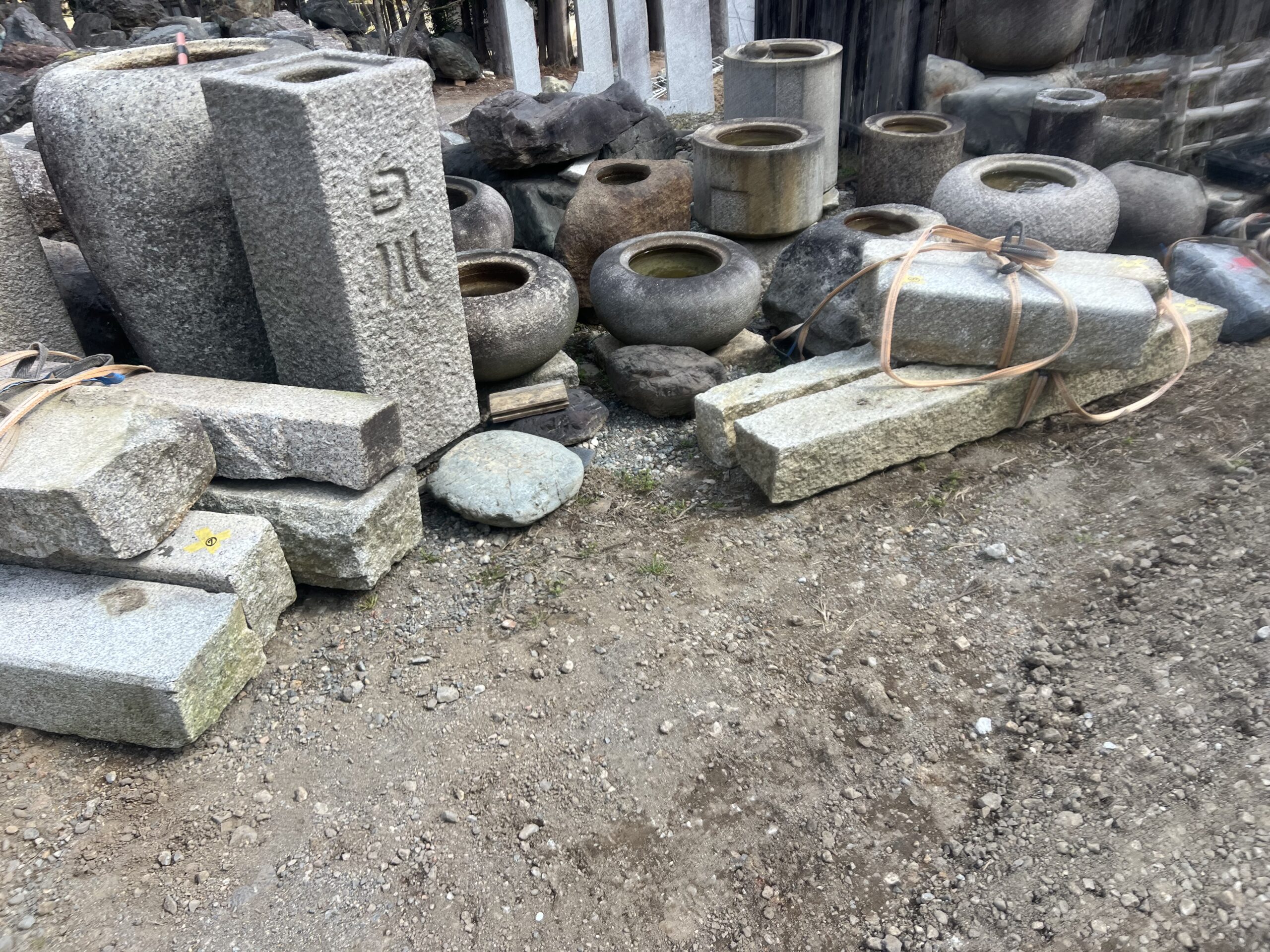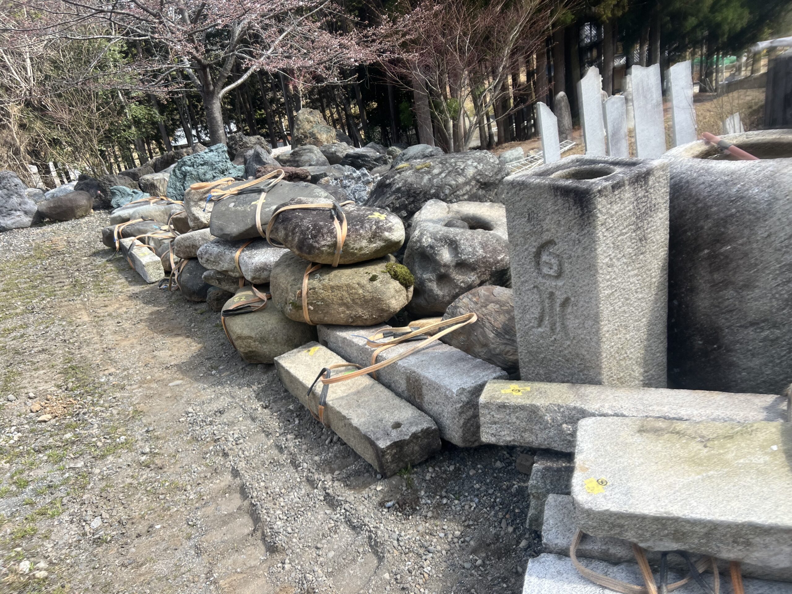 ★★京都の某神社の改修工事に使う 石材 集積しました。全部にスリング付けて出荷します。