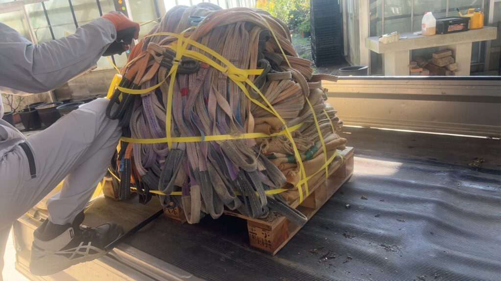 先日仕入れた古材の養生のための麻袋とスリナグベルト200本パレットの梱包して送りました。