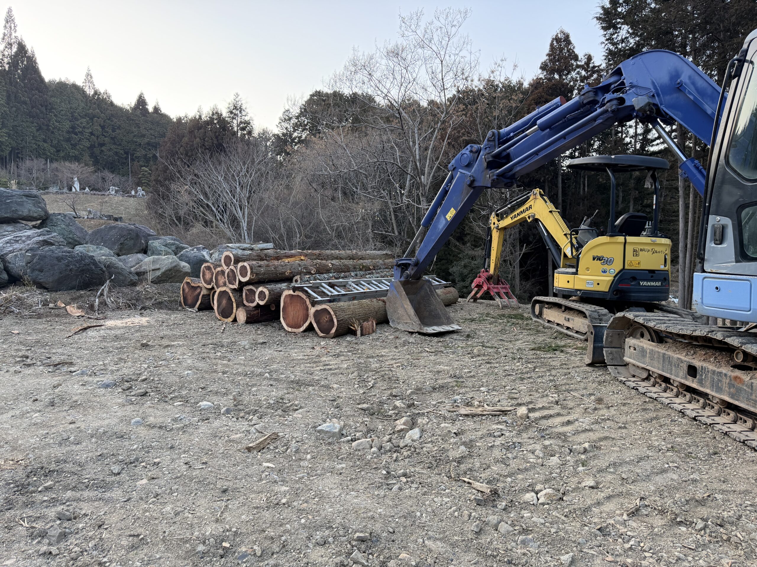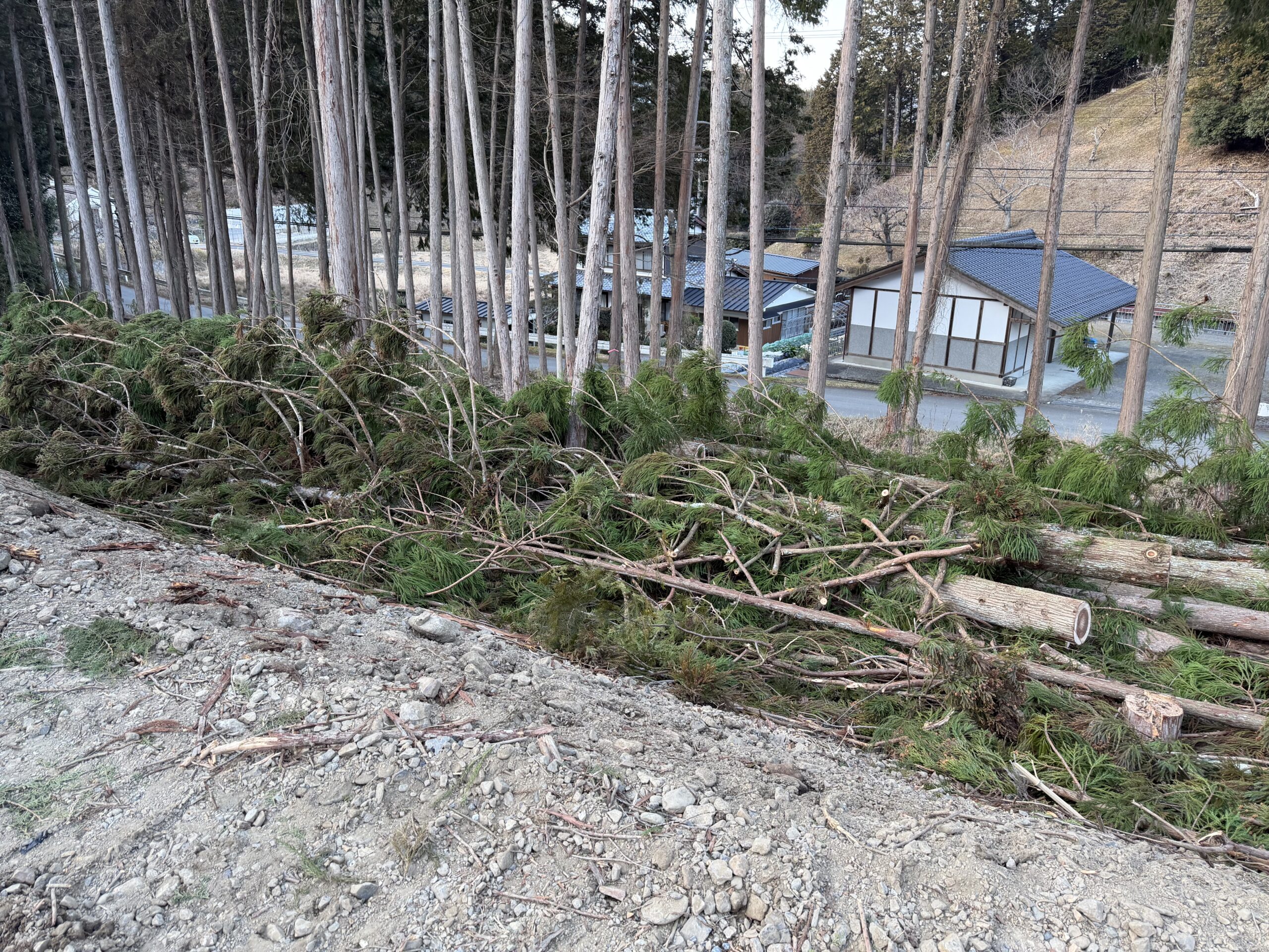 展示場入口の檜林 伐採始めています、 今回全部は倒せませんが 次は来月初旬に 府道から 丸見えになりました。府道の両側 間口400mほどになりました。